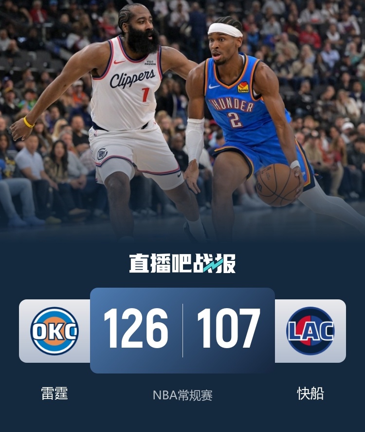 比賽上來,哈登就展示出了火熱的狀態,個人連中三分球包攬球隊開場的前12分,在他的帶領下快船建立起兩位數的領先優勢,次節快船的命中率明顯出現下滑,雷霆把握住機會成功追上比分,半場結束時分差僅剩1分;下半場回來,雷霆的追分勢頭還在繼續,尤其是亞歷山大勢不可擋,他單節狂轟18分5助攻,三節結束時快船已經被反超8分,不過多特因肩膀傷勢提前退賽,末節快船似乎失去了抵抗之力,雷霆再轟一波11-0直接將分差拉開到兩位數,比賽就此失去懸念,亞歷山大末節也沒有再出場,最終雷霆輕取快船迎來開季八連勝。