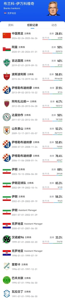 2024年2月24日,伊萬出任中國男足主帥,2025年6月27日下課,期間共帶隊正式比賽14場,戰績為4勝2平8負。其中世預賽36強賽國足1勝2平1負“躺進”18強賽,18強賽國足3勝7負進7球丟20球,提前1輪無緣2026美加墨世界杯。國足也成為伊萬執教生涯的最后一站。